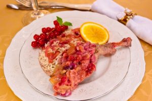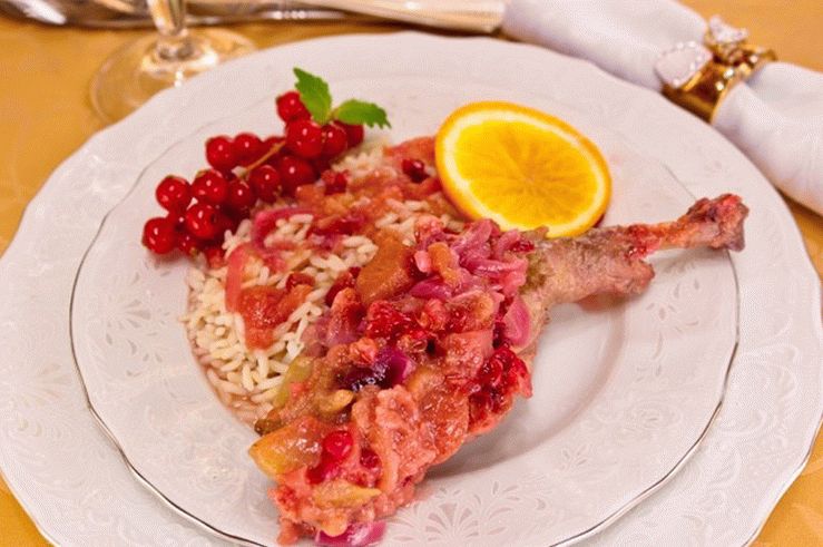 - Sirva el plato terminado con arroz hervido, adornado con naranja, baya, vertiendo salsa de arándano en la carne.