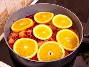 - Cinco minutos después, ponga las naranjas, cortadas en círculos, también cocine a fuego lento un revestimiento a fuego moderado durante otros diez minutos.