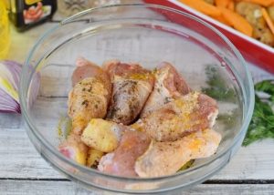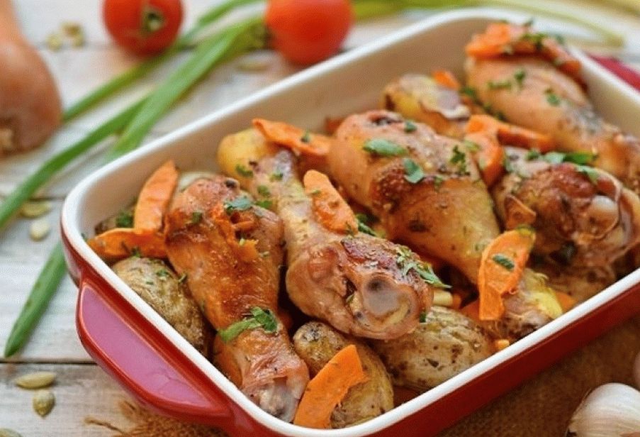 Deliciosas patas de pollo cocinadas en casa con una guarnición de Las papas y las calabazas son excelentes para una mesa festiva. Solo pon todo en un molde y hornea en el horno.