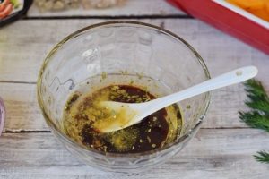 En un tazón, mezcle la salsa de soja, la cúrcuma, el orégano y las verduras. aceite (3 cucharadas).