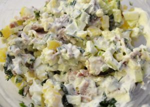 - Cortar papas, pepino, carne y huevos en un cubo del mismo tamaño