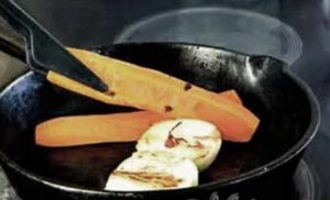 - Pelar las cebollas y las zanahorias, cortarlas por la mitad a lo largo. Hornear en la sartén Pega los dientes en la cebolla.