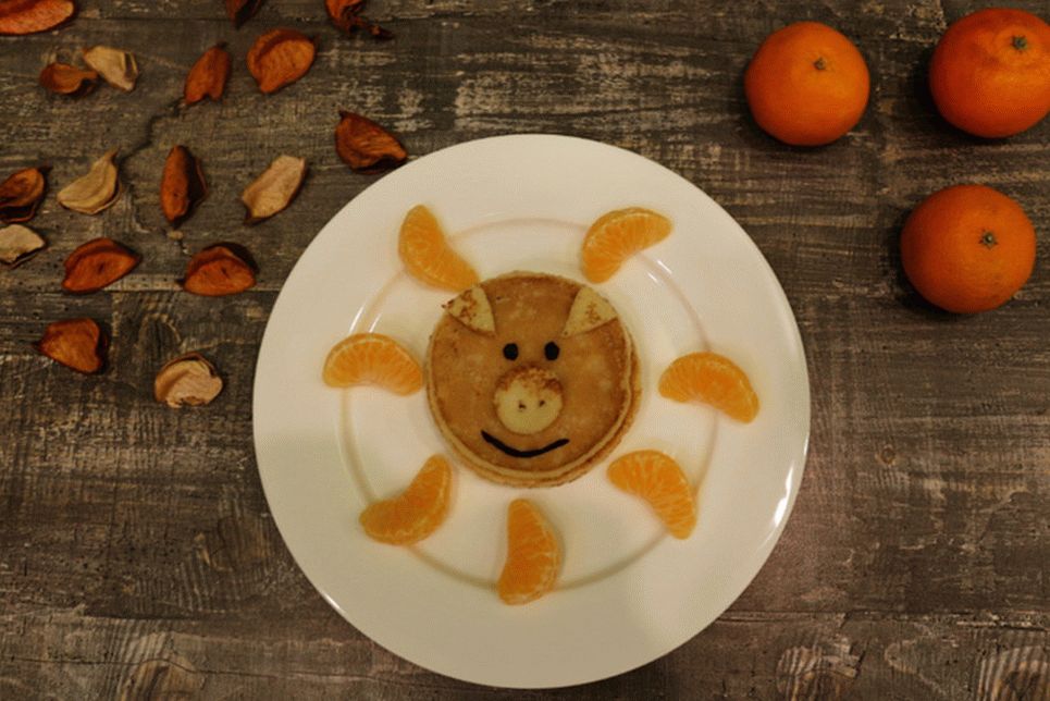 - Cuando todos los panqueques estén cocidos, corte las orejas de los panqueques y lechones De las ciruelas pasas formamos bocas y ojos. Formamos lechones de panqueques y servir. Decorar con mandarinas.