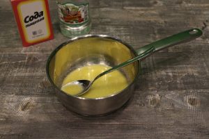 - Derrita la mantequilla a fuego lento. Calentado vierta el aceite en la masa, agregue la soda apagada con vinagre y bata.