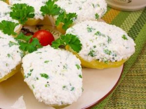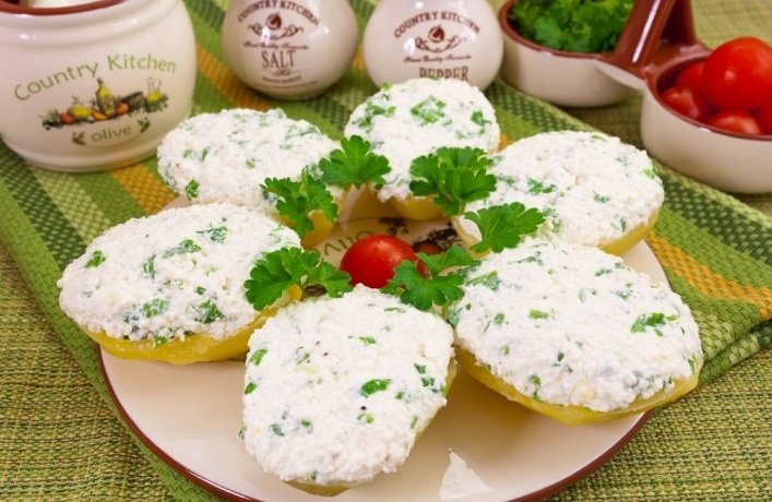 - Divide las papas ligeramente enfriadas por la mitad y extiende aderezo de requesón y crema agria en la superficie de cada mitad.