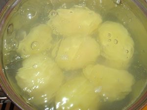 - Pelar el ajo y las papas, lavar. Pase el ajo por la prensa. Sumerja las papas en una sartén con agua con sal y hierva hasta que preparación durante 20-25 minutos, dependiendo del tamaño de las papas.