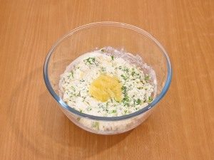 - Mezcle el requesón en un tazón con crema agria, hierbas picadas y puré de papas al ajo. Agrega sal y pimienta. Mezclar de nuevo.