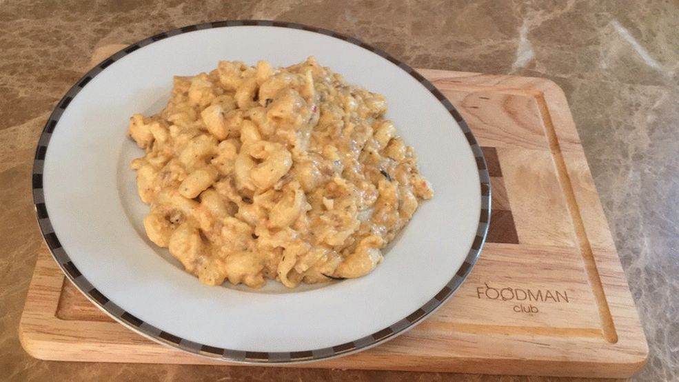 - Sal al gusto, agregue nuez moscada, mezcle, al final agregue queso, mezcle bien. Agregue la salsa a la pasta, mezclar y cocinar por otros 5 minutos.