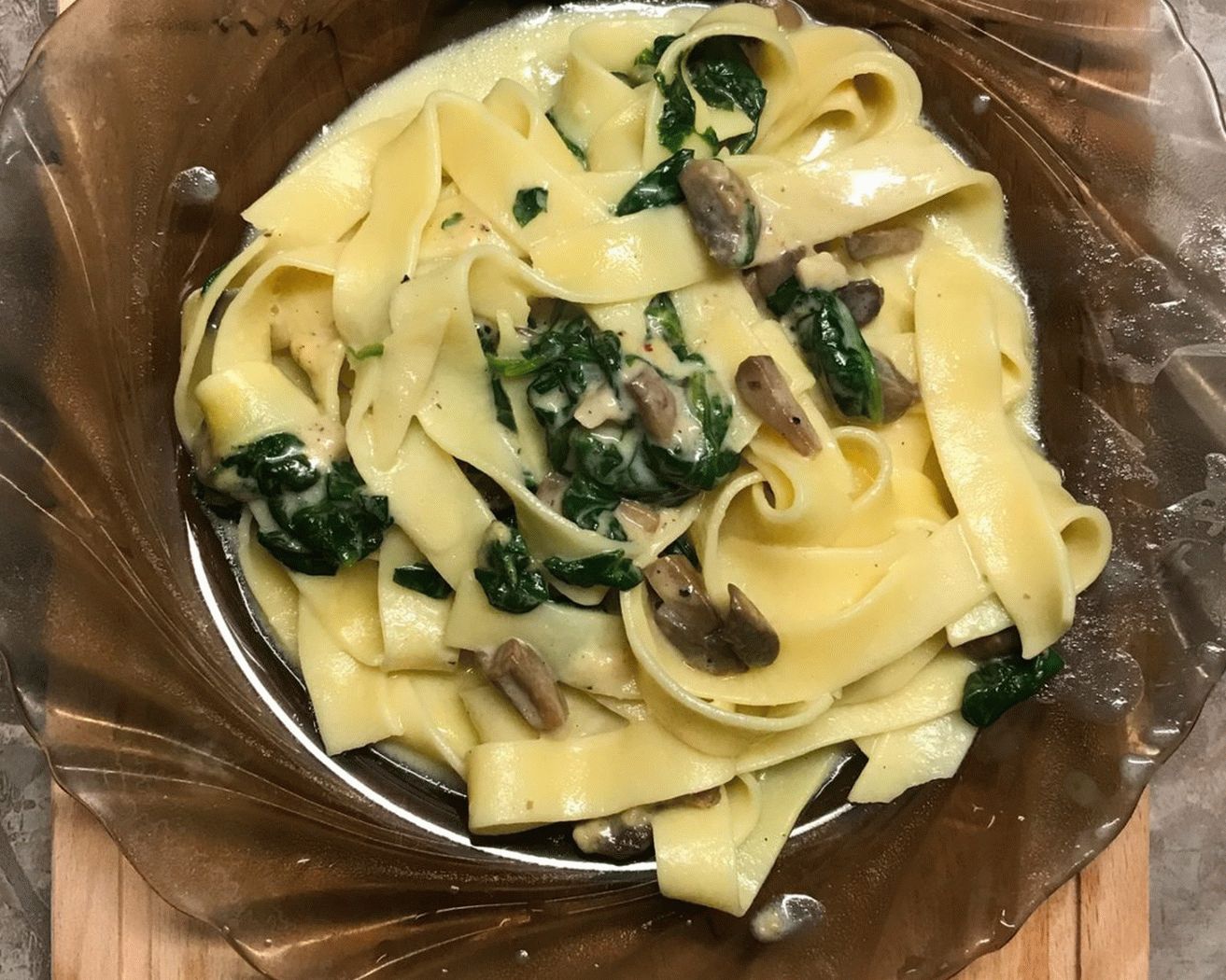 La pasta es un plato tradicional de la cocina italiana. Hay una misa formas y variaciones de la preparación de la pasta, así como las salsas para ello. En Esta receta sugiere hacer deliciosas pastas caseras con champiñones, espinacas y mascarpone crudo. Salsa tierna �el queso hace que este plato se derrita en la boca! El plato es muy sabroso, genial Apto para almuerzo o cena.