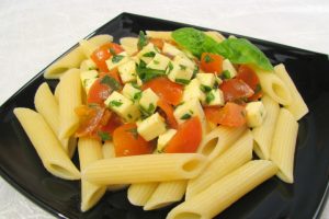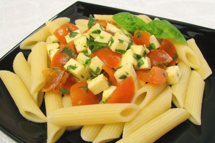Sabroso plato de pasta vegetariana con tomate y mozzarella Es recomendable cocinar este plato principal en casa con mozzarella, solo este queso tiene un sabor delicado y fresco y al mismo tiempo Es ligeramente elástico. Elija pasta de trigo duro, No necesitan ser lavados.