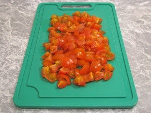- Lave los tomates, cortados en trozos pequeños.