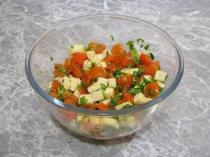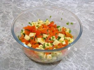 - En un tazón volumétrico, mezcle ligeramente los tomates, el queso y las hierbas. sal y pimienta