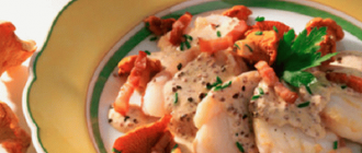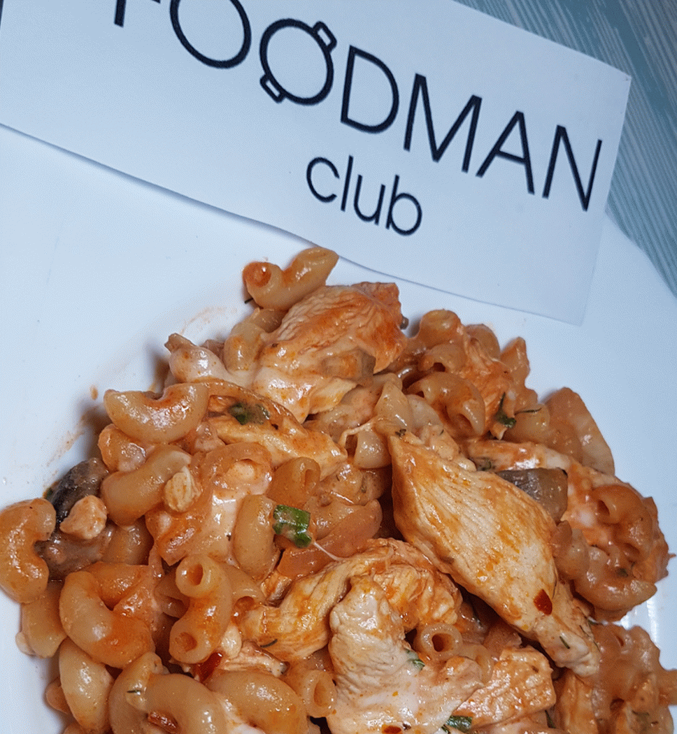 Sabrosa pasta con pollo y champiñones en crema de tomate. la salsa, que se prepara de manera muy simple.