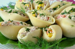 Una merienda original y deliciosa hecha de grandes conchas de pasta puede ser cocinar en casa Rellenamos los caparazones con atún enlatado, queso duro, pimientos dulces, huevos duros, encurtidos y maíz Hacer tal aperitivo no es difícil.