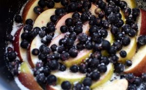 - Lubrique el recipiente multicocina, espolvoree con azúcar (unas cucharas), pon las manzanas en un círculo alrededor del tazón. Agrega la grosella. De nuevo espolvorear con azúcar.