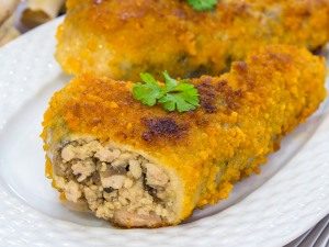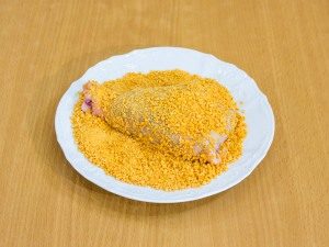 - Enrolle el jamón en un huevo batido, luego – en mezcla de empanado.