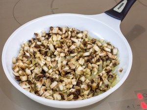 - Freír la sartén en el aceite de cocina. cebollas y champiñones rallados.