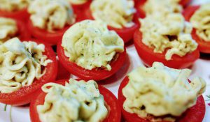 Sabroso y abundante aperitivo de tomates rellenos de crema de pescado y papas, prepararse para una cena festiva en casa no es nada difícil Si no tiene una bolsa de pastelería, use paquete regular, recortando una esquina.