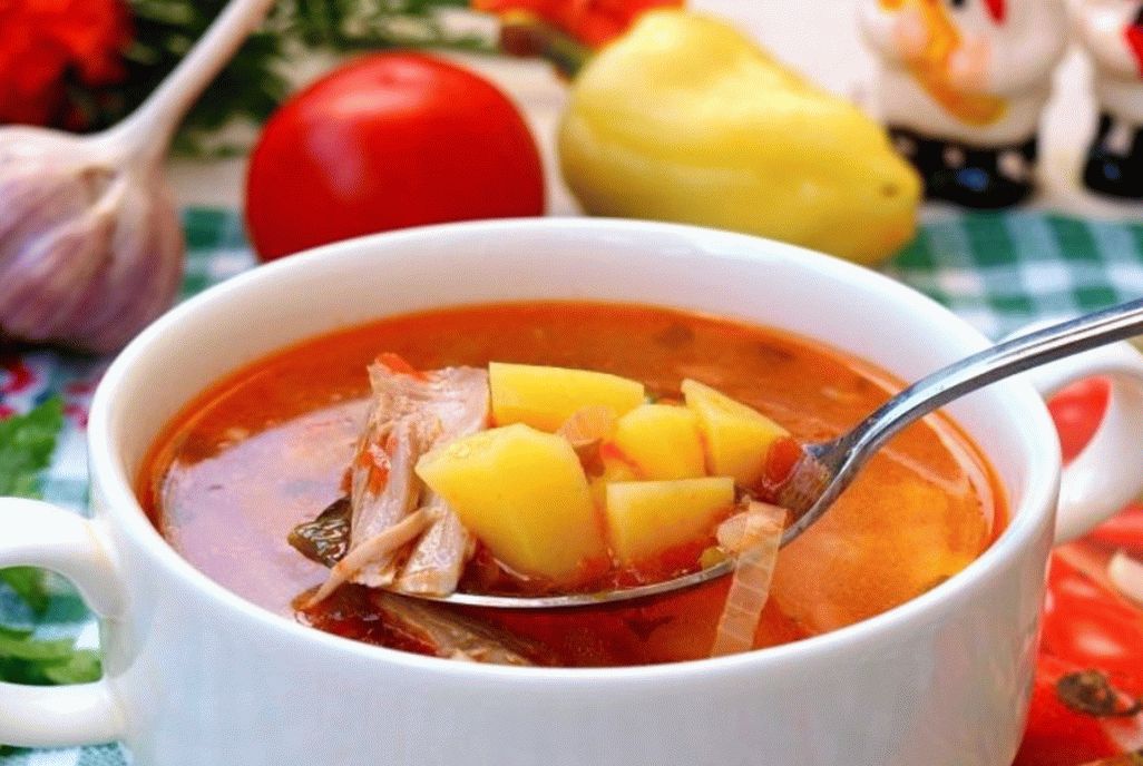 Dieta muy aromática sopa de carne de pavo con verduras. Los tomates y los pimientos harán que el caldo sea fragante y le agregue color Comida ligera y abundante para toda la familia. Con el fin de él cocinar en casa, necesitaremos:
