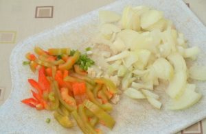 - Picar los pimientos con la cebolla para la sopa. Pasamos en una sartén juntos con mantequilla durante uno o dos minutos.