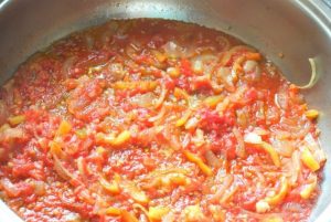 - Rallar los tomates y untar los pimientos con cebolla. Mezcle y cocine a fuego lento durante 7-10 minutos.