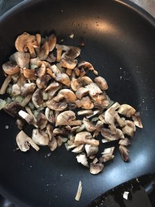 - Verter en una sartén con aceite de oliva, freír ligeramente el ajo y Consíguelo, esto se hace para darle sabor. A continuación, freír en esto cebolla de mantequilla, agregue los champiñones picados lavados. Sal y pimienta Fríe por 5-7 minutos.