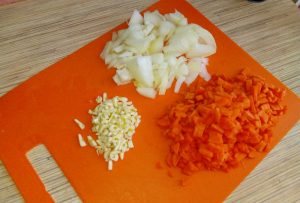 - Limpiamos cebollas y zanahorias. Los cortamos en cubos grandes. Finamente no se pueden cortar, ya que en este caso se untarán cuando cocinar, y deben sentirse en el pilaf preparado. Ajo cortar en tiras finas.