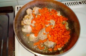 - Agregue zanahorias picadas al pollo. Las zanahorias deben dar su aceite de color