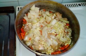 - Ahora agregue las cebollas y el ajo y páselos hasta que estén dorados colores Lo que estamos preparando ahora es lo más importante en pilaf y llamado zirvak (carne con verduras, frita en aceite).