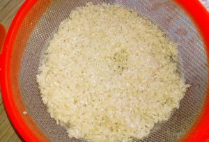 - Lavamos bien el arroz para que desaparezca todo el exceso de gluten. Es Se hace fácilmente con un colador o tamiz. El arroz está ligeramente seco.