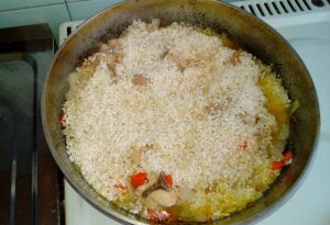 - Vierta el arroz en un tazón y póngalo en una capa uniforme superficie Vierta con tres vasos de agua, sal y agregue especias Cubra, reduzca el calor y deje languidecer 30 minutos
