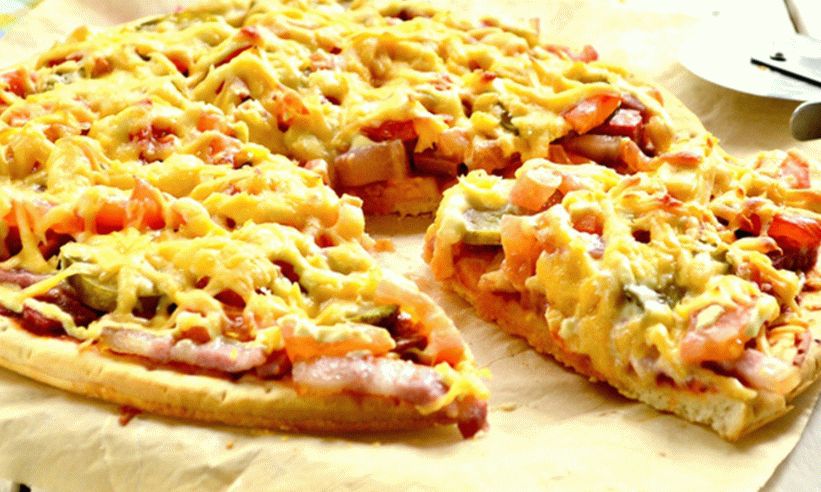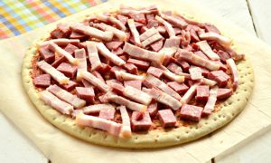 - Engrase la base de la pizza con salsa de tomate. Salchicha y Tocino cortar al azar y colocar de manera uniforme en la base.