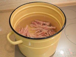 - Para limpiar, lavar, llenar las patas de pollo con tres litros de agua, llevar a ebullición, retirar la espuma, hervir a fuego lento un par a fuego moderado horas