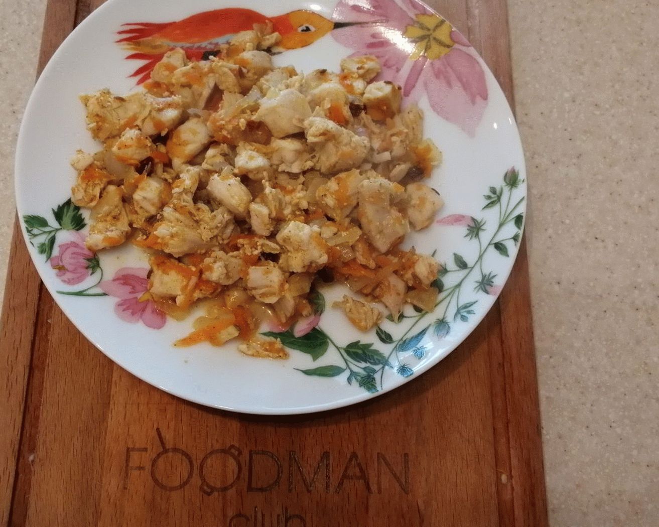 - Rallar las zanahorias en un rallador. Agregue zanahorias y pollo.