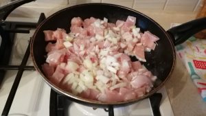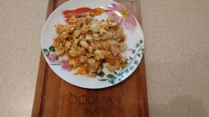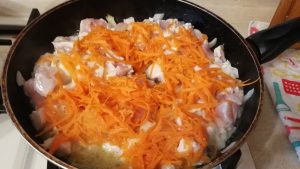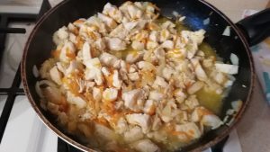 - Freír el pollo con cebolla en aceite vegetal.