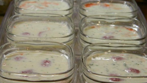 - Ponga fresas en el fondo de las tazas de yogurt.