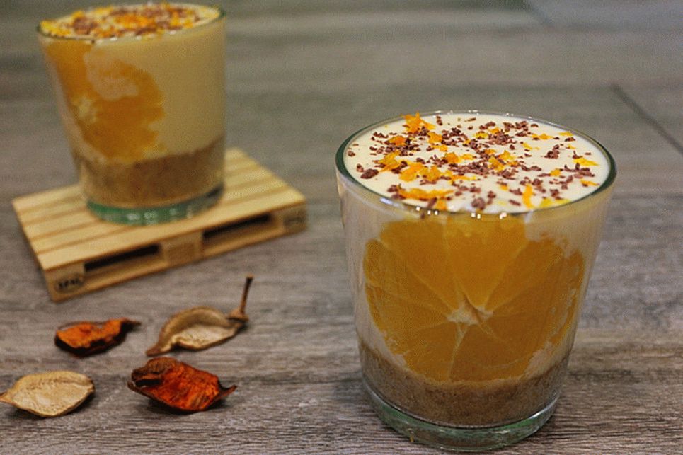 - En el fondo del vaso, separe las migajas de las galletas. En el lado Los lados del cristal trazan los círculos de color naranja. Espacio vacio las tazas llenan la mezcla cremosa. Espolvorear postre de chocolate migas y ralladura de naranja.