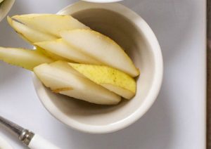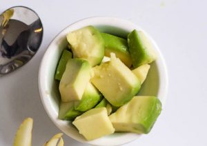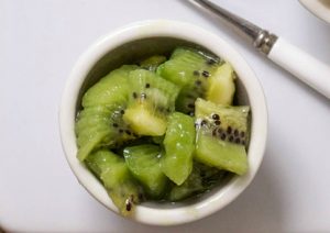 - Limpiamos aguacate y kiwi. Luego los cortamos en pedazos, y la pera … rodajas
