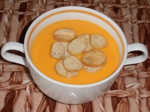 - Cortar las rebanadas de pan en cubos y secarlas en un precalentado. Horno ¡Sirva puré de sopa con galletas! Que tengas un buen apetito!
