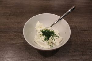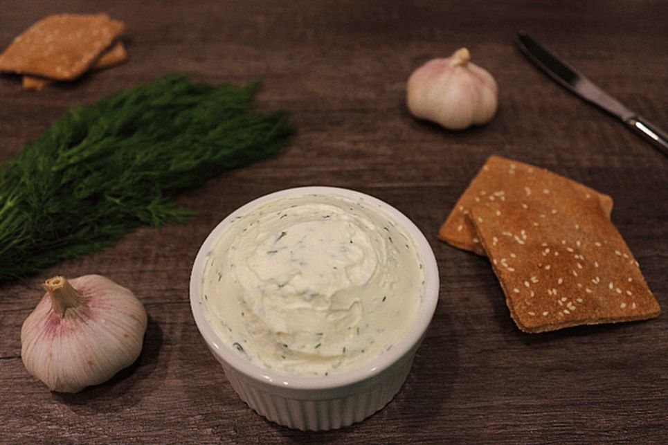- Pase el ajo por una prensa, agregue al queso con eneldo.