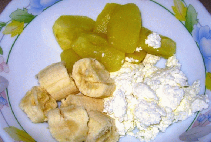 - En la etapa final, coloque el horneado en el tazón de la licuadora manzanas, plátano pelado y requesón colado. Batir todo hasta No obtener una masa homogénea aireada. Mantenga el requesón adentro no más de un día en el refrigerador Mezcle la cuajada con fruta Es necesario inmediatamente antes de alimentar al niño Agregar azúcar No se recomienda la cuajada.