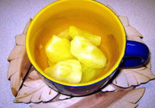 - Ahora en el microondas horneamos manzanas. Para estas piezas doblar la manzana pelada en un recipiente adecuado y colocar en microondas por 4 minutos.