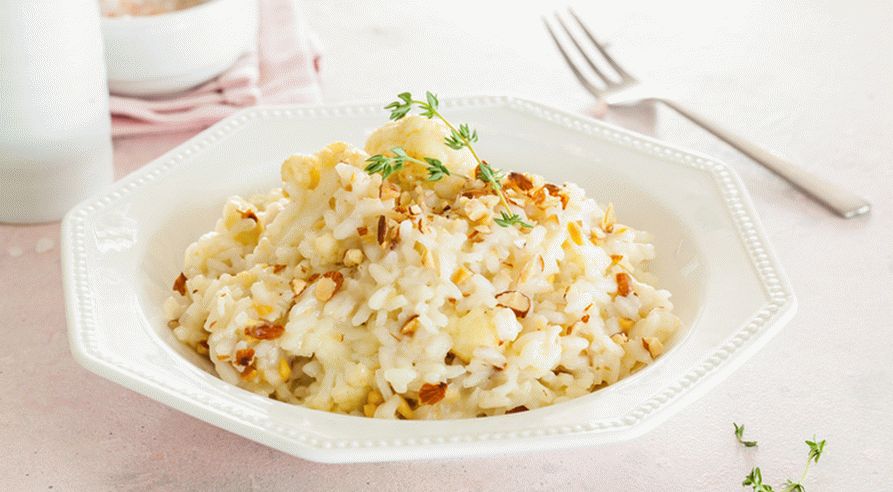 - En la olla, donde se frió la coliflor, agregue el segundo la mitad del aceite vegetal, vierta el arroz y fríalo por 1 minuto. Agregue el vino y cocine hasta que se evapore. Vierta 1 cucharón y cocine el caldo hasta que esté completamente absorbido. Continuar así vierta 1 cucharón hasta que se acabe el caldo.