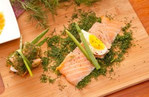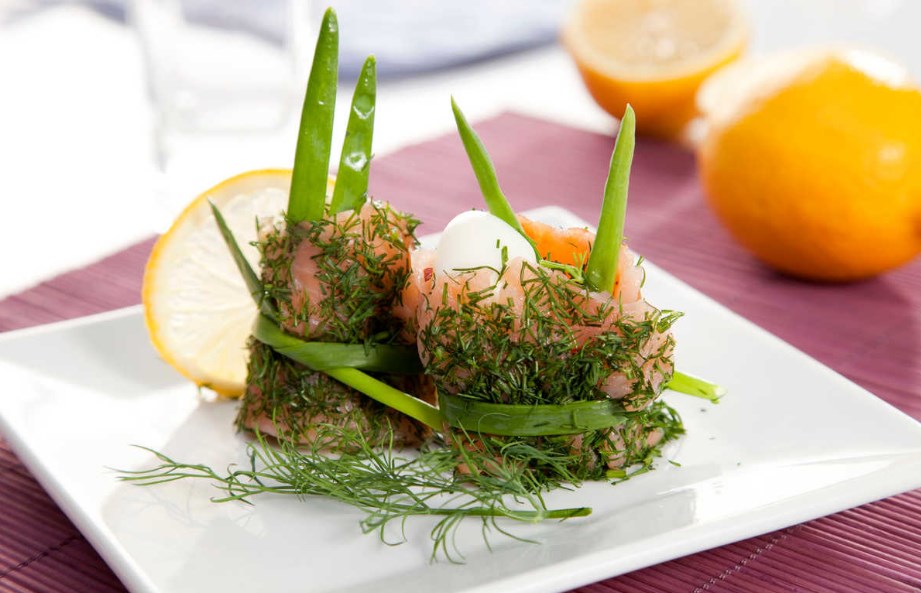 Eneldo de salmón finamente picado y salado en tiras (20 piezas). Jugo Limón espolvorear con salmón, untar sobre el eneldo, agregar una rodaja huevos, 2 plumas de cebolla verde y espolvorear con pimentón.
