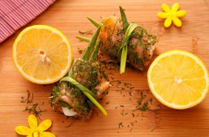 Convertimos el salmón con huevo y cebolla en un rollo y lo amarramos Una pluma de cebollas verdes. Ponemos hermosos rollos en un plato para que las cebollas verdes sobresalgan del rollo e inmediatamente sirvan.