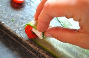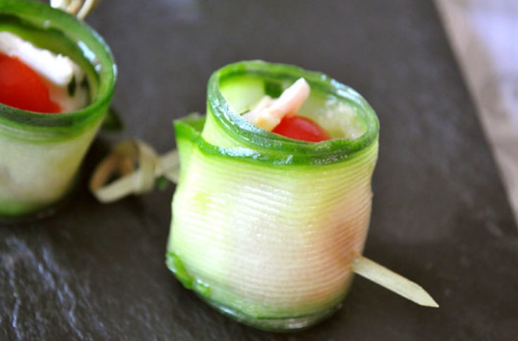 Deliciosos rollos de pepino fresco, tomates cherry y prepararemos queso de cabra en casa para la mesa festiva.