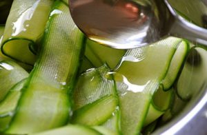Corta un pepino largo y fresco en rodajas finas y largas, enviar a un tazón, espolvorear con sal, verter aceite, agregar ajo picado, mezclar y dejar por 30 minutos.