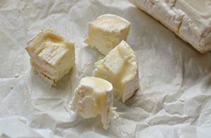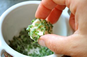 Pica finamente la cebolla verde y enrolla en trozos de queso de cabra.