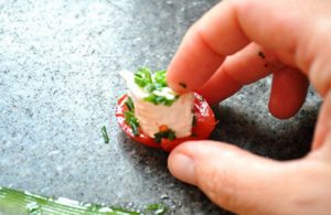 Los tomates cherry cortados por la mitad y quitan las semillas con pulpa, corte el queso de cabra en trozos (12 piezas).
