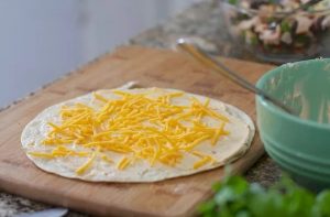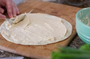 Mezcle el queso crema con el condimento de pollo y de manera uniforme. aplicar en porciones iguales sobre la tortilla.